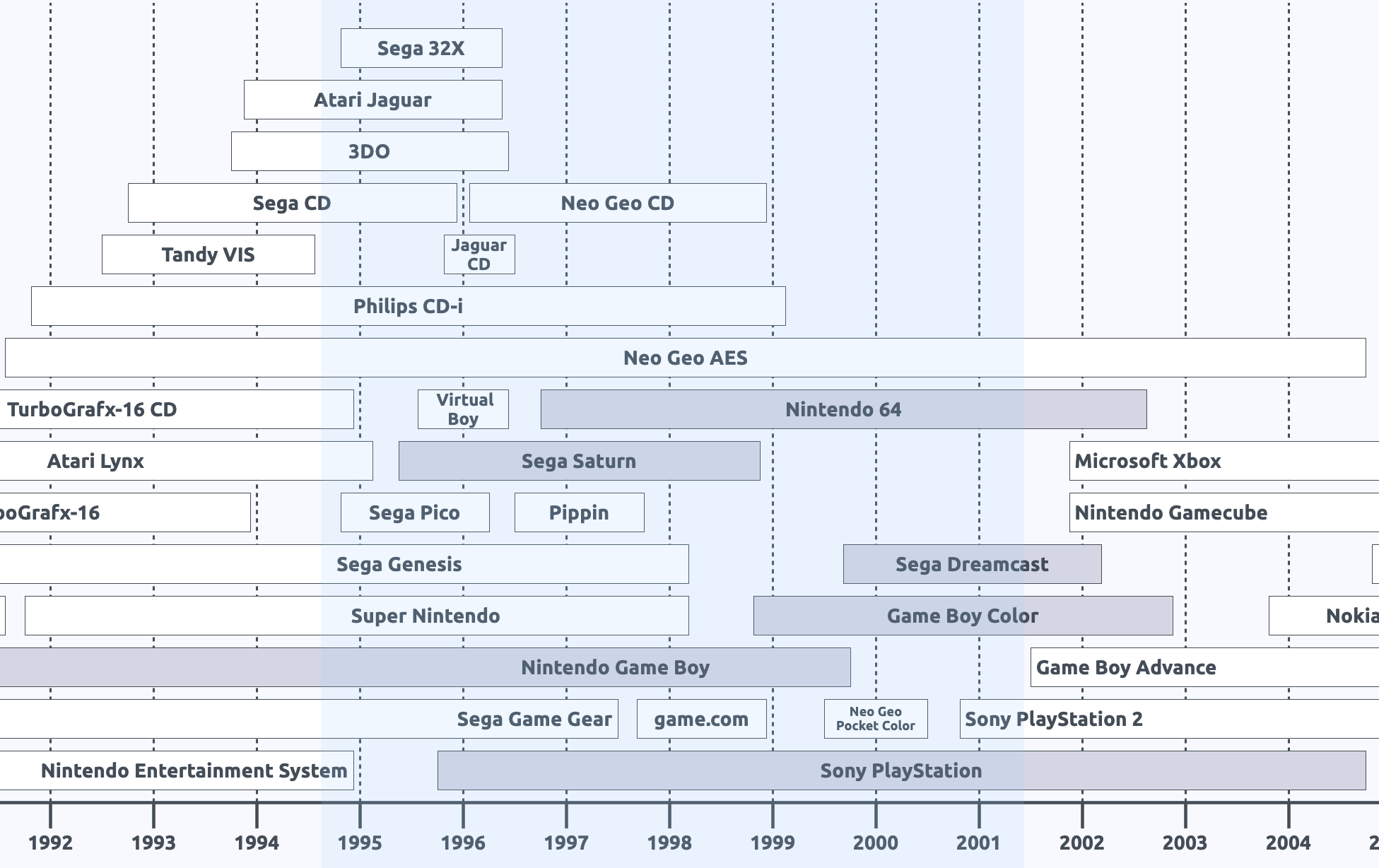 The first step is tracking down everything that qualifies as a "Monday Night War game". There were a lot of systems available between September 4 1995 and March 26 2001. Looking at an abridged version of the console timeline we can count a total of 23 systems that were sold during this time. We have the end of the 4th generation, most of the 5th generation, and the very beginning of the 6th generation.