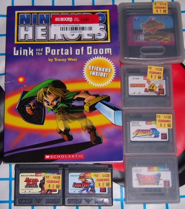 Five Neo Geo Pocket Color games ($2 each), World Series Baseball for Game Gear ($1), and Link and the Portal of Doom ($1.98)