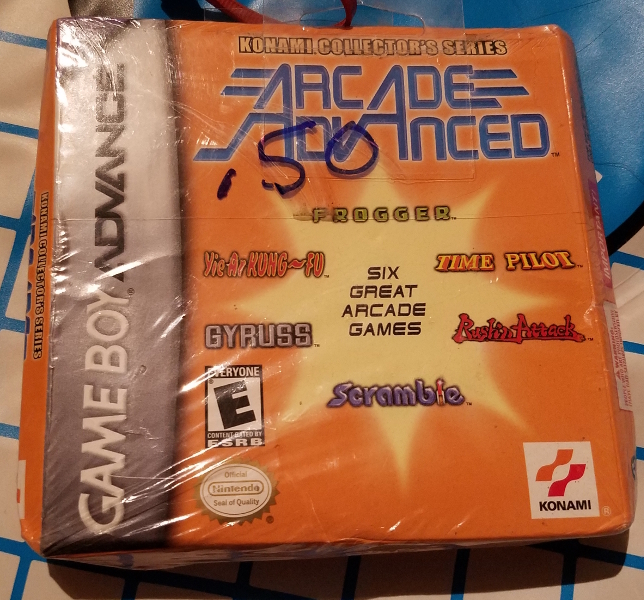 This was at a yard sale that seemed to be about 99% trash. I don't mean trashy items, I mean stuff they should have just thrown out. I don't know why I didn't turn around. They had some GBA stuff but the only appealing (not destroyed) thing was this flattened yet still shrink-wrapped copy of Konami Arcade Advanced. This is a thing I will actually play a bunch so it was worth the stop.