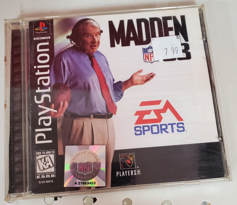 Here's a copy of Madden 98 for $7.99 found at a local thrift store. This is first time I've seen an old version for more than $1-$2 in a while. Madden games are usually cheap for obvious reasons - they sold in huge numbers and most fans of the series prefer a version with current rosters. There are exceptions to the latter, like NHL '94 on the Genesis or NFL 2K2 on the Dreamcast.