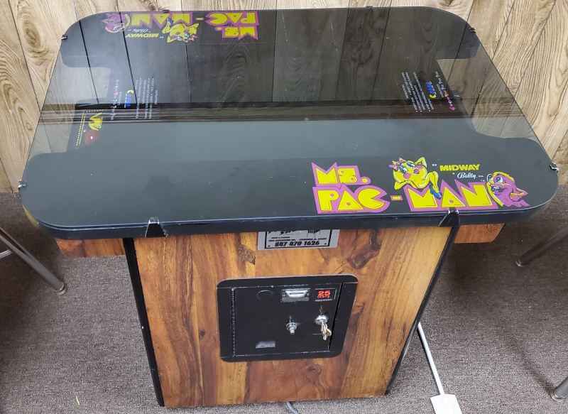 I pulled over for an estate sale sign and it was overall meh. Everything was way overpriced. It's an estate sale, you're supposed to be getting rid of stuff. This particular house had a lot of home theater items that were not radically discounted. Down in the basement I spotted this original Ms Pac-Man cocktail cabinet with no price listed.