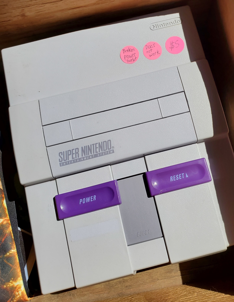 Last year I found a Family Boy for $5 at a sale with various import games. It was the first, and I assumed last, time I would ever see import games at a garage sale. I was sort of right and wrong. The same house, on the same weekend, had the same sale in 2023. So I decided to stop and see if there was anything new. I don't recall this broken Super Nintendo being there before. I have two working Super Nintendos, I don't need a broken one too. So I left this and maybe someone else considered it an amazing find.