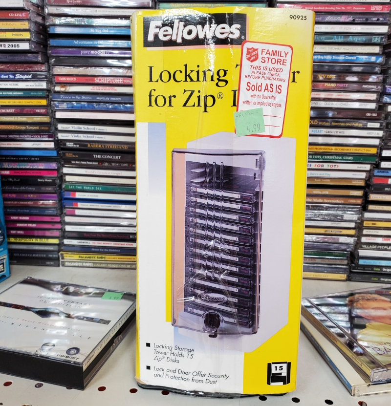 Locking storage for 15 Zip disks just under $5... I suppose 25 years ago I would have jumped on this. I didn't have anything on my Zip disks that needed a lock but still. Really, that lock is very useless. Someone could fit that whole tower into a pocket of their 1998 JNCO jeans. So I guess it's only preventing someone in your own house from (easily) seeing what you are storing? What exactly are you storing that this is a concern?
