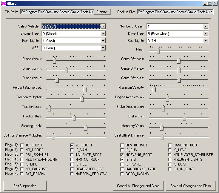 OK, yeah there are a bunch of utilities around to edit handling.cfg files. This one is different in two ways - 1) it uses sliders making it nearly impossible to enter a value that will crash the game and 2) it automatically creates a backup just in case something goes badly.