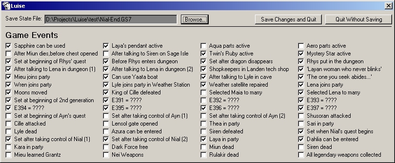 This one edits game events in Phantasy Star III. It lets you do wacky things like use Laya's Pendant or the aero parts in any generation.