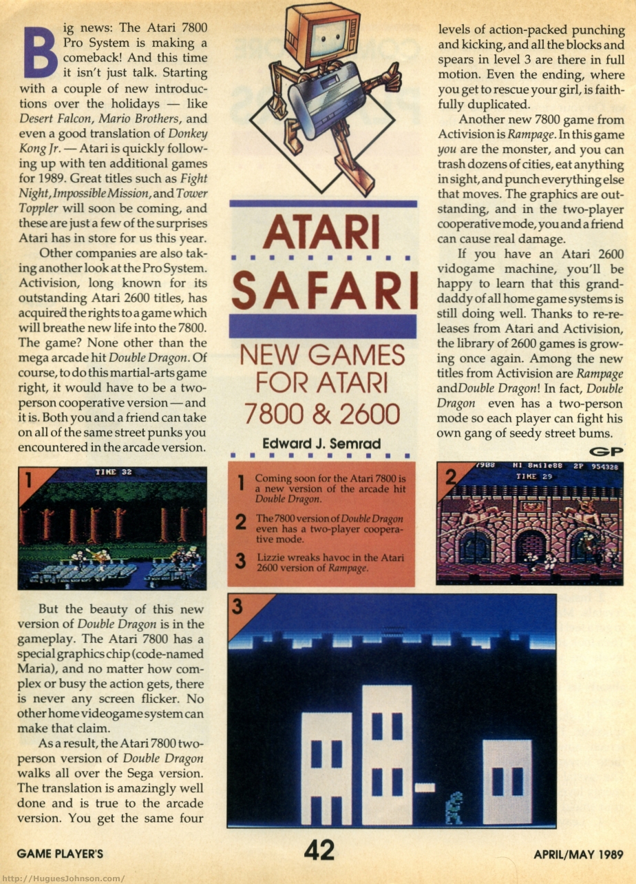 "Big news: The Atari 7800 Pro System is making a comeback!" I think for it to be a "comeback" you have to have been on top at some point. George Foreman made a comeback, Peter McNeeley can't. See how that works? Don't get me wrong, the Atari 7800 is a fun system but it never stood a chance against the NES. From a play control standpoint, the 7800 version of Double Dragon was debatably better than the NES or SMS versions making it a bright spot in the otherwise mediocre library. Graphically, it's pretty obvious why it tanked though.